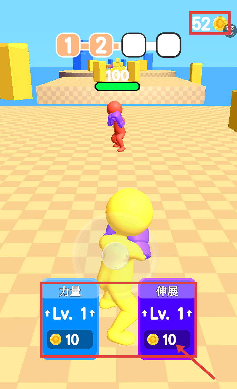 1、消耗金幣升級【伸展-Lv.1】和【力量-Lv.1】,提升角色戰(zhàn)斗屬性,為后續(xù)對戰(zhàn)做好準(zhǔn)備。