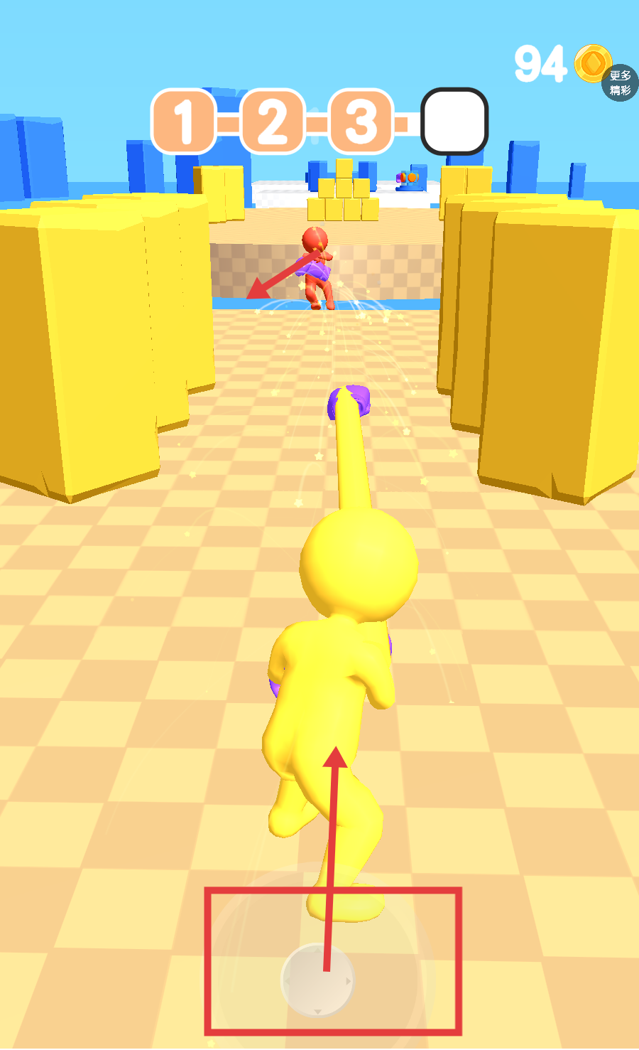 3、通過移動控制角色,追擊逃跑的紅色敵人,利用場景地形保持追擊節(jié)奏。