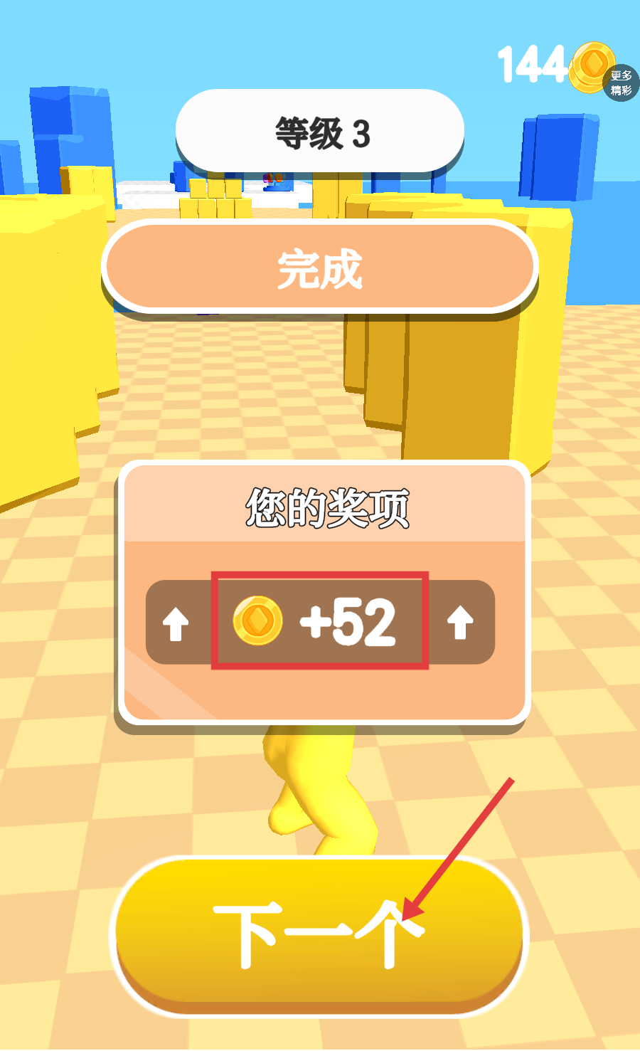 4、完成【等級3】后,獲得【+52金幣】,點擊【下一個】按鈕,開啟新關(guān)卡挑戰(zhàn)。