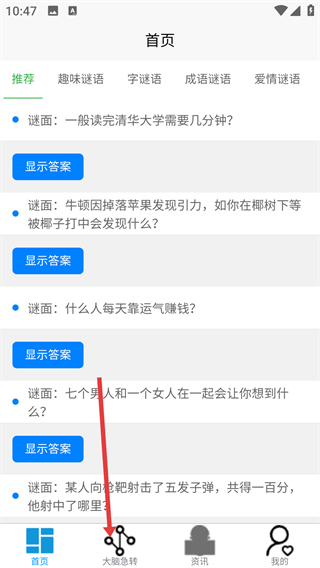 1、在首頁(yè)可查看推薦、趣味謎語(yǔ)等分類的謎語(yǔ),點(diǎn)擊底部【大腦急轉(zhuǎn)】按鈕,進(jìn)入對(duì)應(yīng)板塊。