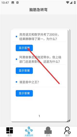 2、進(jìn)入【大腦急轉(zhuǎn)】板塊后,可看到“腦筋急轉(zhuǎn)彎”主題的卡片內(nèi)容,準(zhǔn)備查看相關(guān)題目。