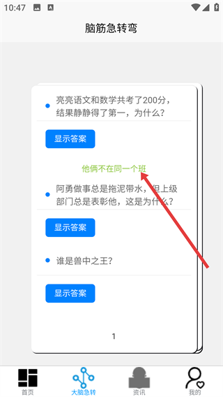 3、在“腦筋急轉(zhuǎn)彎”頁(yè)面,瀏覽題目如“亮亮語(yǔ)文和數(shù)學(xué)共考了200分,結(jié)果靜靜得了第一,為什么?”,點(diǎn)擊題目下的【顯示答案】按鈕。