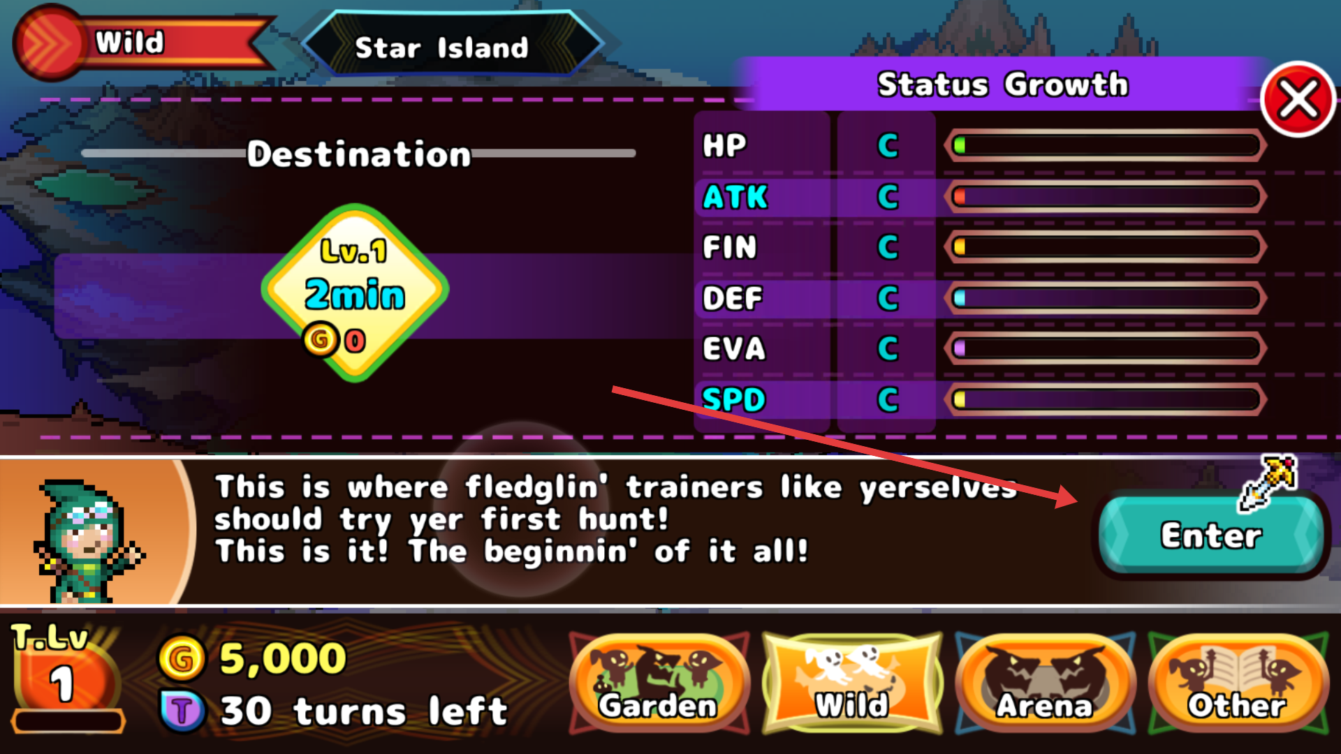 3、進(jìn)入【Star-Island】界面后,查看其屬性成長,然后點(diǎn)擊【Enter】按鈕,開始在該島嶼探索。