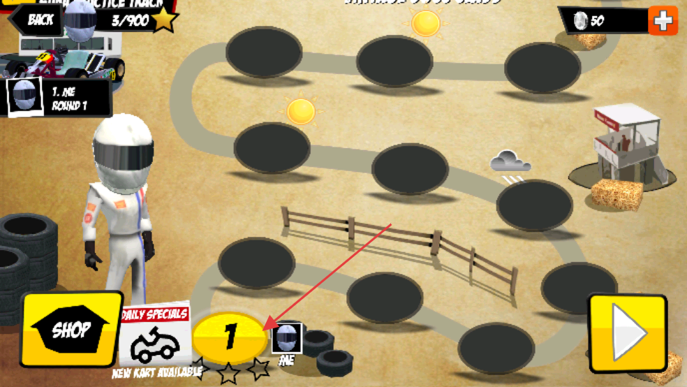 1、點(diǎn)擊帶有數(shù)字“1”的黃色按鈕,進(jìn)入第一場(chǎng)卡丁車比賽,準(zhǔn)備在賽道上操控卡丁車角逐名次。