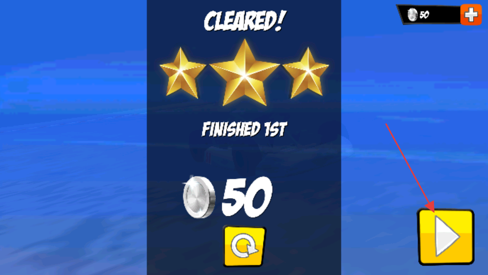 4、順利完成比賽并獲得第一名后可獲得銀幣獎(jiǎng)勵(lì),點(diǎn)擊右側(cè)黃色箭頭按鈕,繼續(xù)挑戰(zhàn)后續(xù)卡丁車賽事。