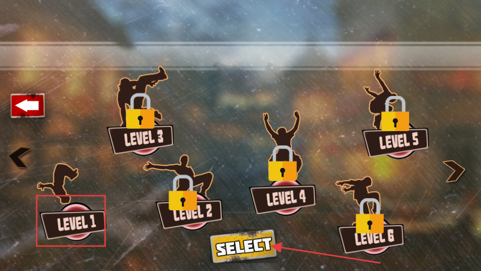 1、點(diǎn)擊“LEVEL1”并按下“SELECT”按鈕,進(jìn)入第一關(guān),開啟跑酷挑戰(zhàn),準(zhǔn)備在城市場(chǎng)景中操控角色移動(dòng)。