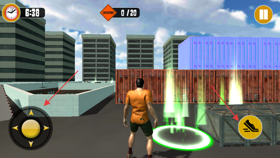 2、利用左側(cè)方向按鈕控制角色移動(dòng)方向,右側(cè)鞋子按鈕可讓角色加速,朝著綠色光圈目標(biāo)前進(jìn)。