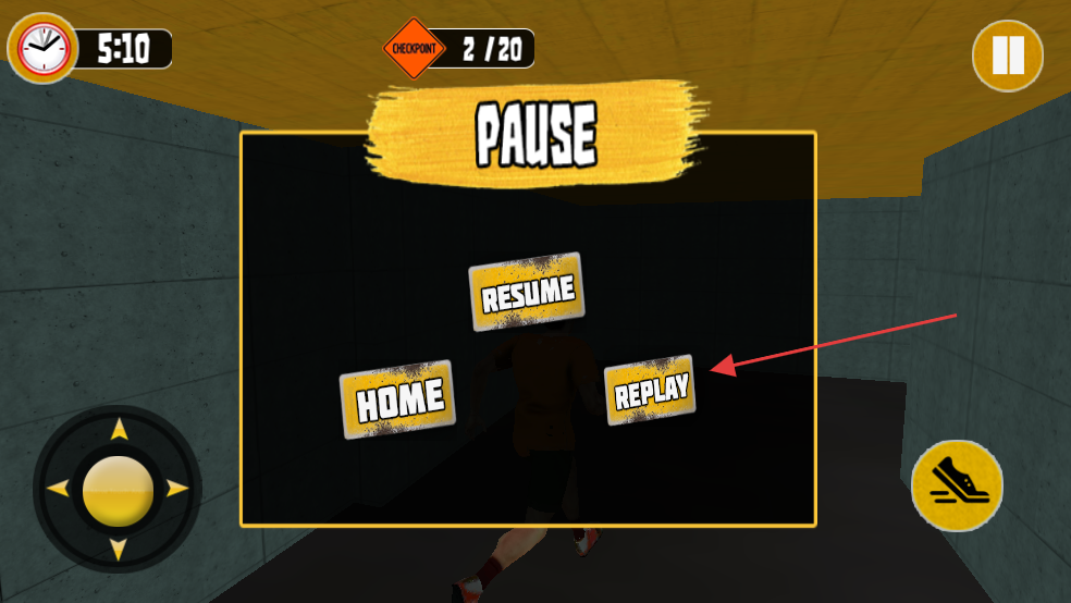 4、若想重新挑戰(zhàn)當(dāng)前關(guān)卡,在暫停界面點(diǎn)擊“REPLAY”按鈕,即可重新開始第一關(guān)的跑酷,規(guī)劃更優(yōu)的路線。