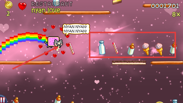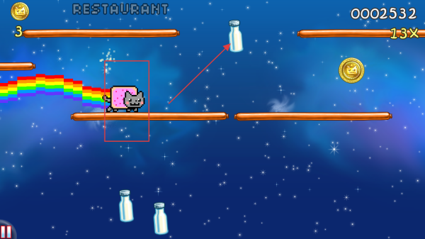 彩虹貓迷失太空是一款2D橫版像素風(fēng)格的跑酷手游。延續(xù)了彩虹貓標(biāo)志性的彩虹軌跡與魔性背景音樂,需要操控這只飛行的貓咪在太空?qǐng)鼍爸写┰秸系K收集道具,體驗(yàn)充滿歡樂與挑戰(zhàn)的冒險(xiǎn)之旅。所有內(nèi)容都以闖關(guān)形式展現(xiàn),過程中獲得的得分可以用于兌換金幣,購(gòu)買道具完成更難的闖關(guān)挑戰(zhàn)。操作簡(jiǎn)單直觀但充滿技巧性,需要準(zhǔn)確把握跳躍時(shí)機(jī)避開各種障礙物。