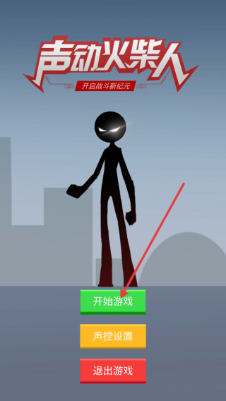 1、進入游戲,點擊【開始游戲】按鈕,開啟【聲動火柴人】的戰(zhàn)斗之旅,準備迎接火柴人對戰(zhàn)挑戰(zhàn)。