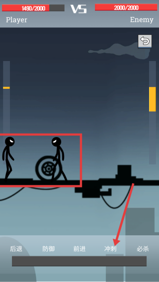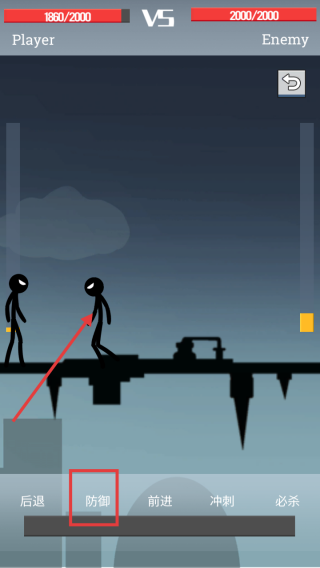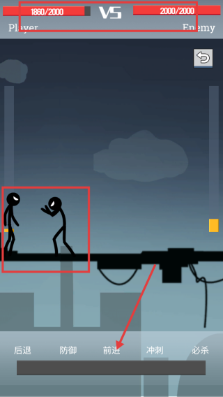 2、戰(zhàn)斗時,根據(jù)戰(zhàn)況點擊【前進】按鈕,讓火柴人向敵人靠近,為發(fā)起攻擊創(chuàng)造有利位置。