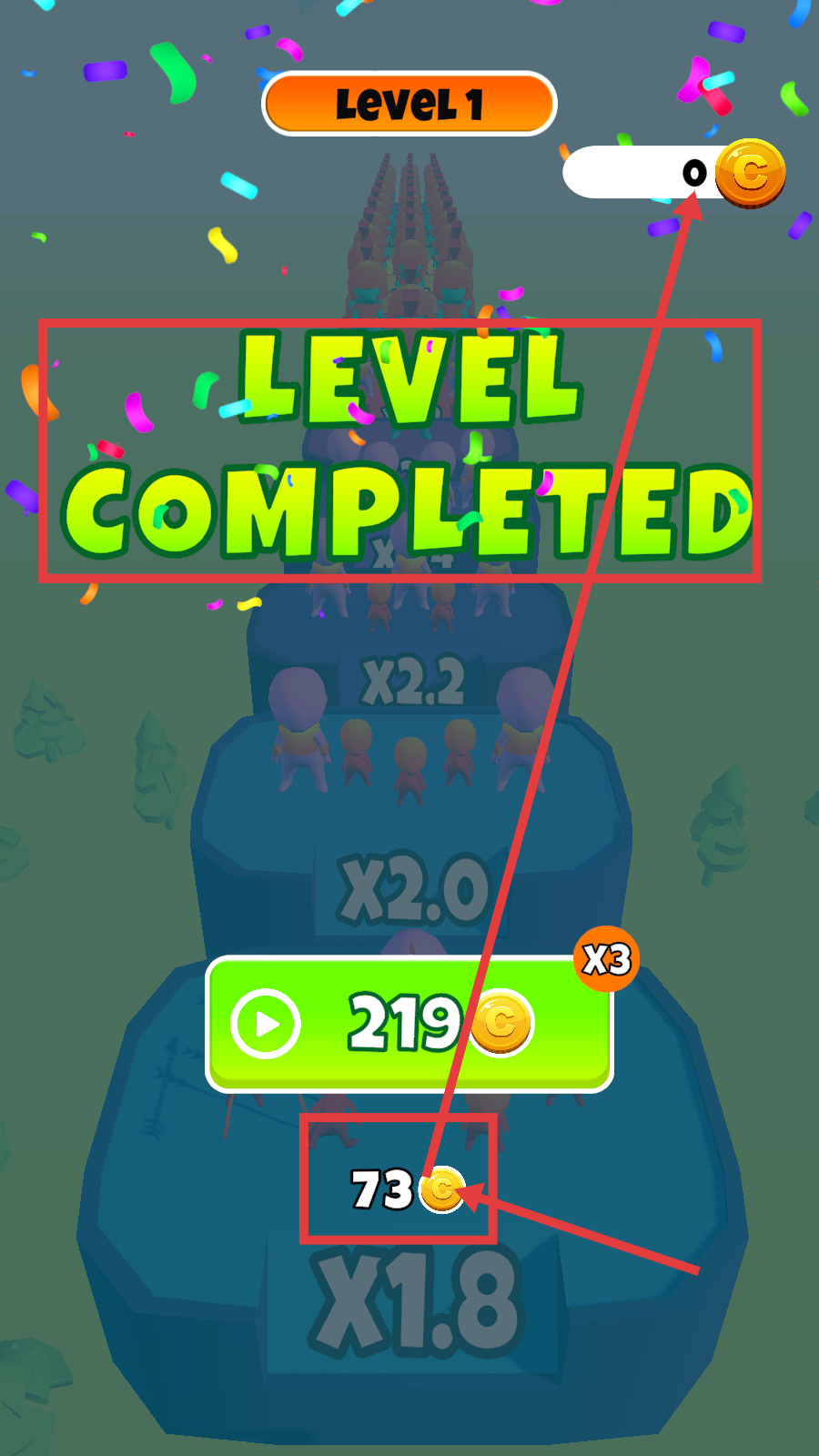 4、完成【Level-1】后,獲得【73】金幣獎勵,點擊繼續(xù)可進入下一關(guān),積累金幣用于角色養(yǎng)成或解鎖內(nèi)容。