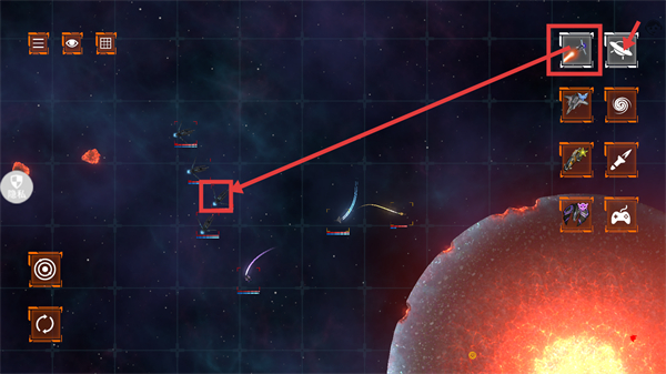 2、戰(zhàn)斗中選擇飛船類型,操控飛船瞄準(zhǔn)敵方單位,利用武器發(fā)起攻擊,逐步消滅太空敵人。