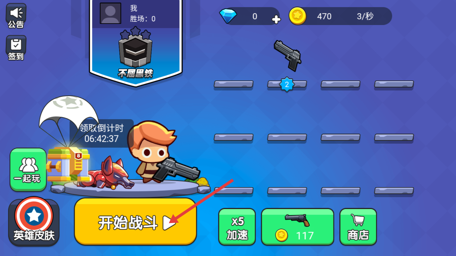 1、在主界面點(diǎn)擊【開始戰(zhàn)斗】,進(jìn)入對(duì)戰(zhàn)關(guān)卡,可先留意【簽到】【一起玩】功能,再開啟戰(zhàn)斗。
