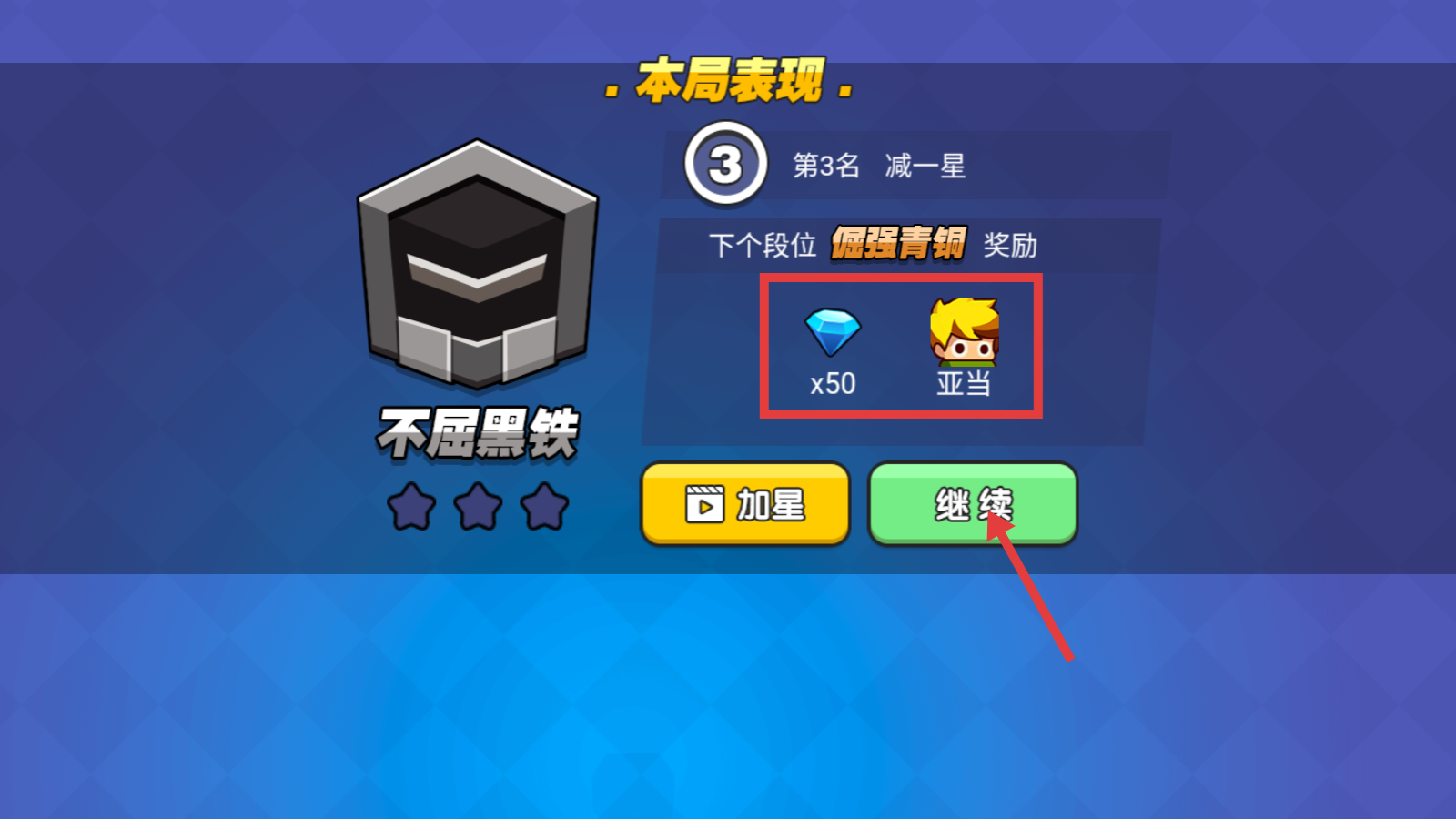 4、對(duì)局結(jié)束后,領(lǐng)取【鉆石-x50】【亞當(dāng)】獎(jiǎng)勵(lì),點(diǎn)擊【繼續(xù)】進(jìn)入下一局,積累資源提升段位。
