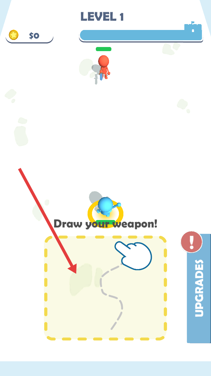 1、在繪制區(qū)域按照提示畫出武器,這是戰(zhàn)斗的關(guān)鍵步驟,畫出的武器將決定攻擊能力。