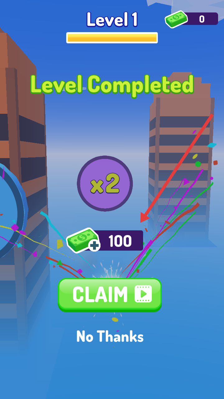 4、關(guān)卡完成后,可選擇點擊CLAIM按鈕觀看廣告領(lǐng)取雙倍獎勵,或點擊NoThanks繼續(xù),總結(jié)投擲技巧,提升游戲表現(xiàn)。