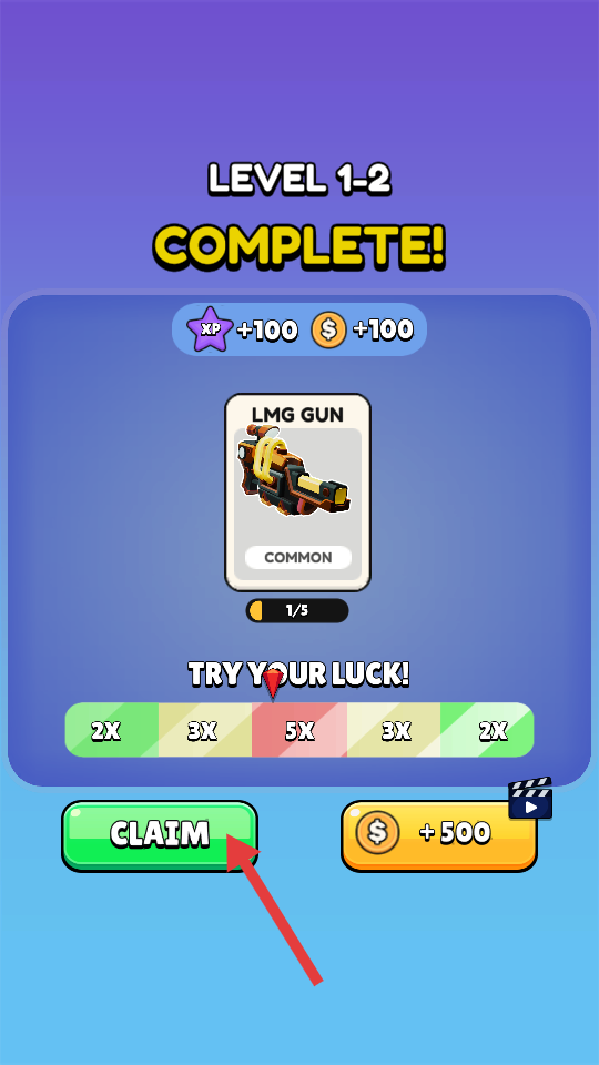4、關(guān)卡完成后,點(diǎn)擊【CLAIM】按鈕,領(lǐng)取經(jīng)驗(yàn)、金幣和武器等獎(jiǎng)勵(lì)。