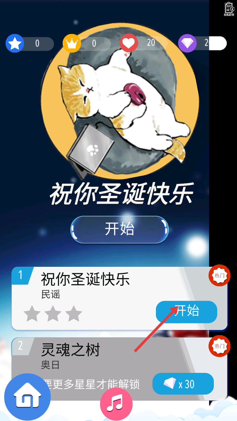 1、選擇【祝你圣誕快樂】民謠歌曲,點(diǎn)擊【開始】,進(jìn)入音樂節(jié)奏挑戰(zhàn),開啟游戲進(jìn)程。