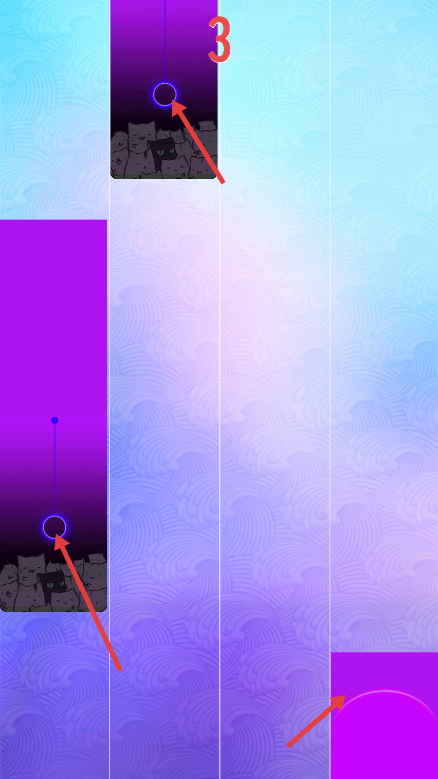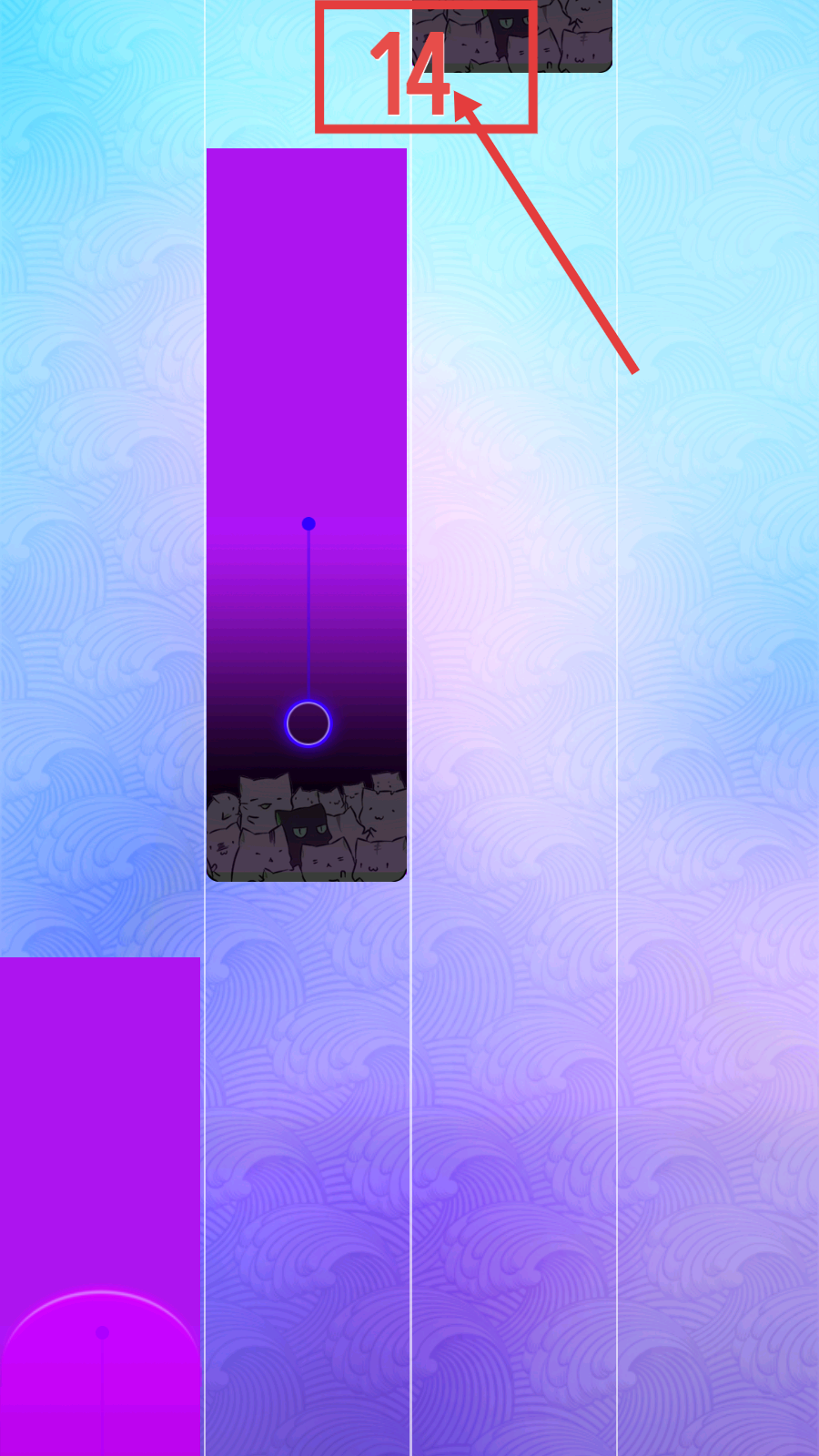 3、持續(xù)按照音樂節(jié)奏,關(guān)注上方數(shù)字-14變化,精準(zhǔn)操作紫色圓圈,提升分?jǐn)?shù)。