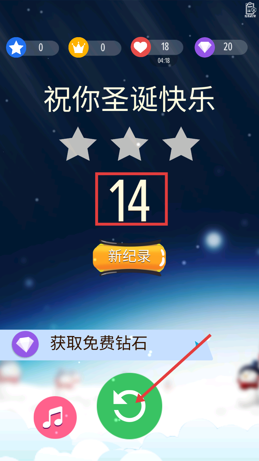 4、挑戰(zhàn)結(jié)束后,獲取新紀(jì)錄-14,點(diǎn)擊綠色重玩按鈕,再次挑戰(zhàn)【祝你圣誕快樂】歌曲,沖擊更高分?jǐn)?shù)。