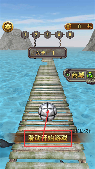 1、在關(guān)卡1界面,按照提示【滑動(dòng)開始游戲】,操控金屬球開啟木橋冒險(xiǎn)挑戰(zhàn)。
