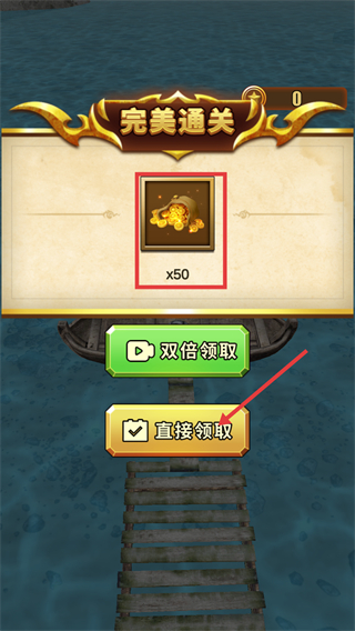 4、完美通關(guān)后,點(diǎn)擊【直接領(lǐng)取】獲取50金幣獎(jiǎng)勵(lì),積累資源以挑戰(zhàn)后續(xù)關(guān)卡。