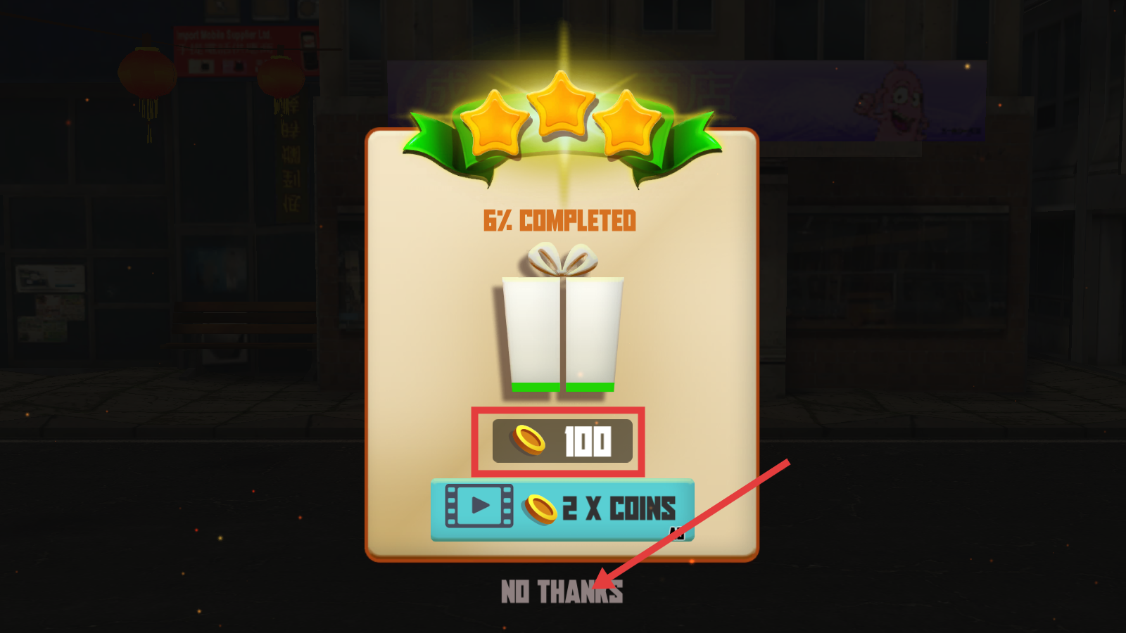 4、戰(zhàn)斗結束后,可領取【100】金幣獎勵,若不想觀看廣告翻倍,點擊【NO-THANKS】即可繼續(xù)游戲。
