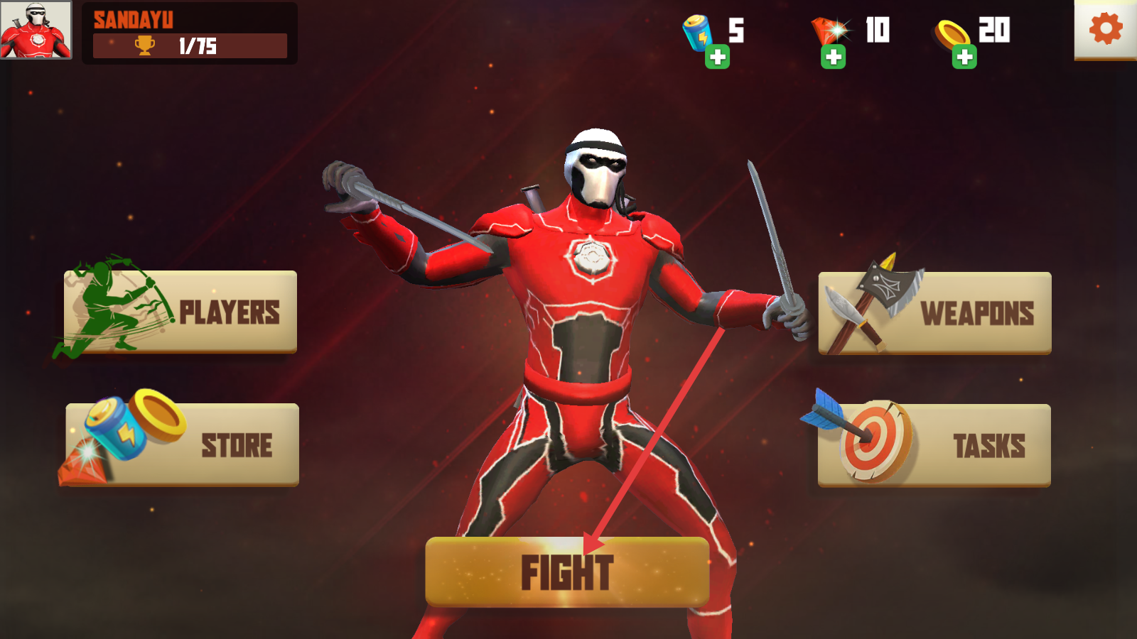 1、進入游戲主界面后,可先查看【PLAYERS】【WEAPONS】等功能,熟悉后點擊【FIGHT】按鈕開啟戰(zhàn)斗。