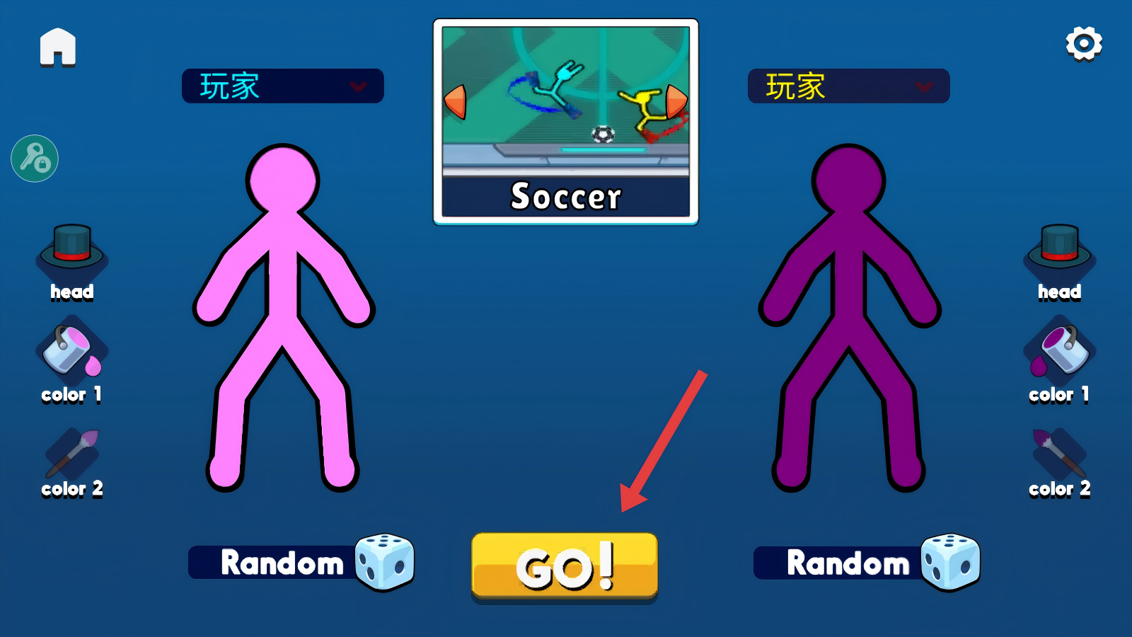 1、選好火柴人外觀后,點擊【GO】進入【Soccer】模式,和對手來場足球?qū)Q,先調(diào)整好狀態(tài)再開戰(zhàn)哦。
