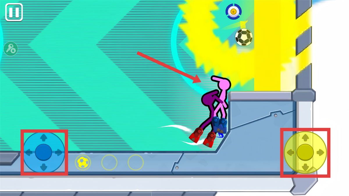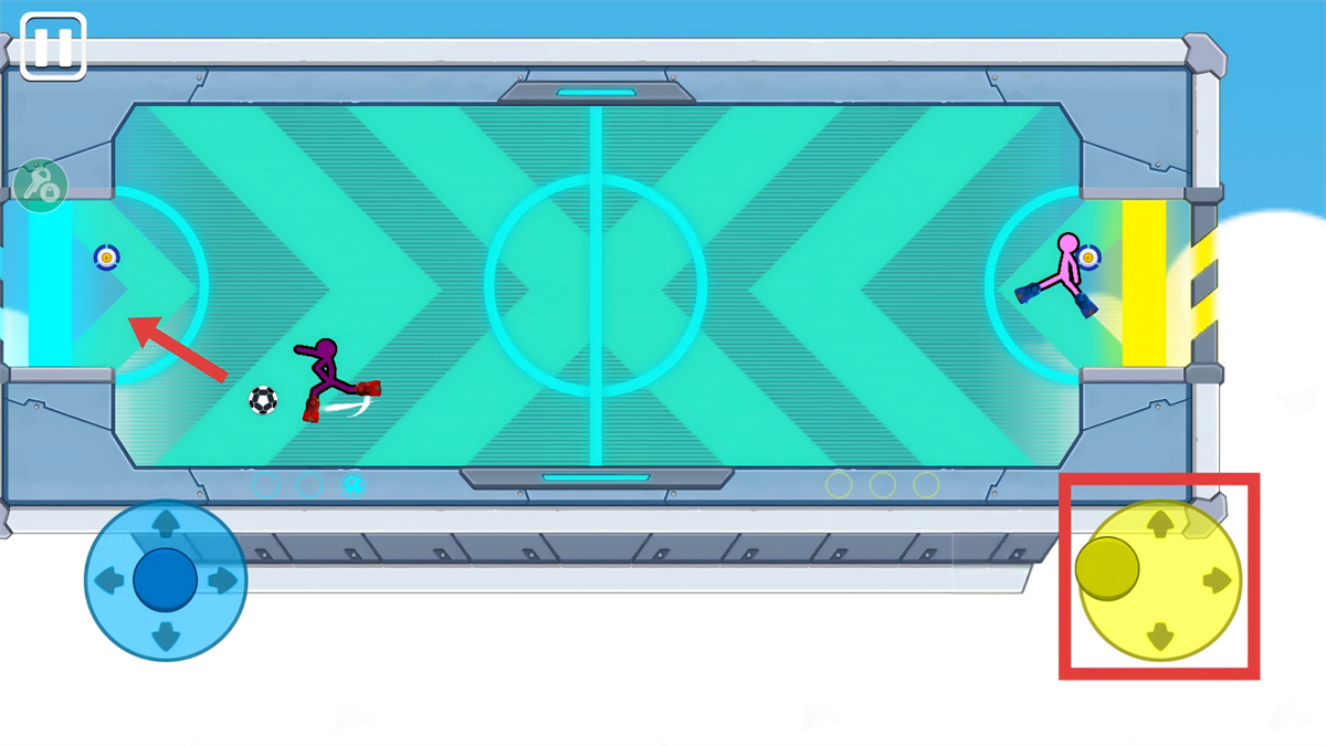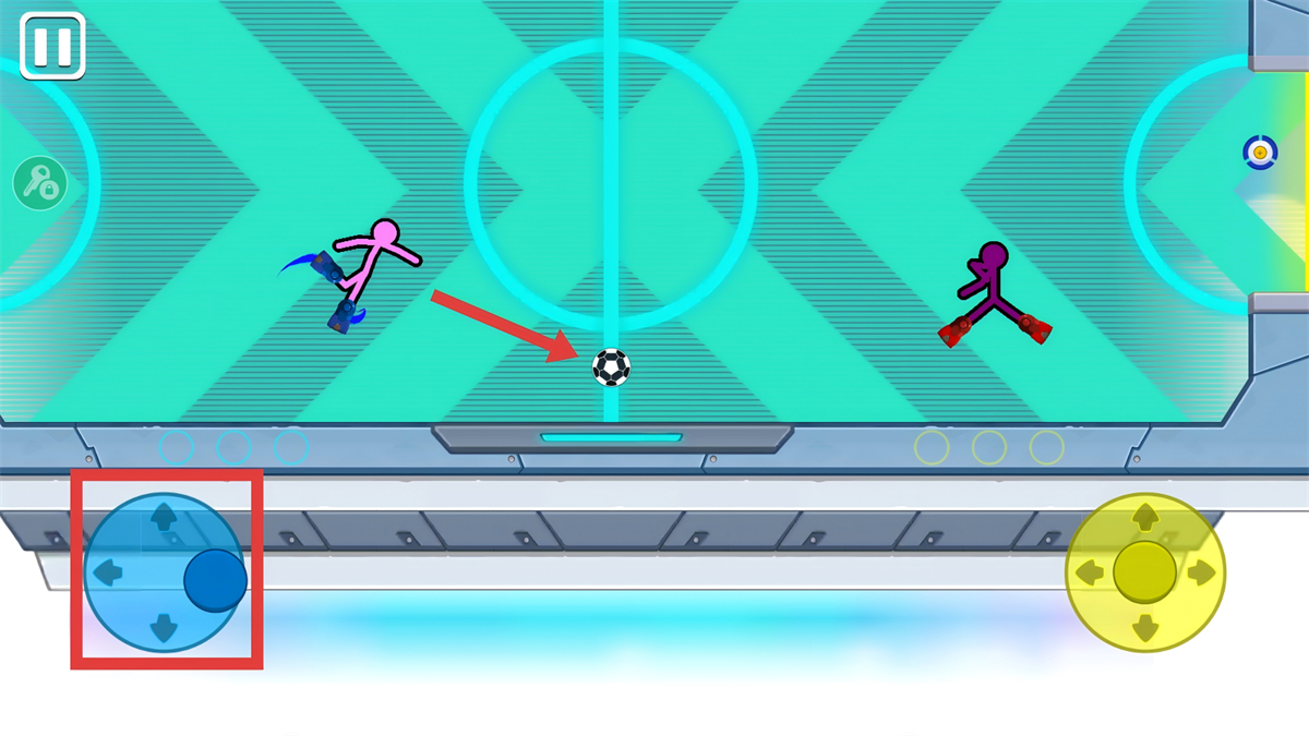 2、比賽中用左側(cè)藍色輪盤操控粉色火柴人移動,搶先爭奪足球,把控好方向,才能占據(jù)進攻先機呢。