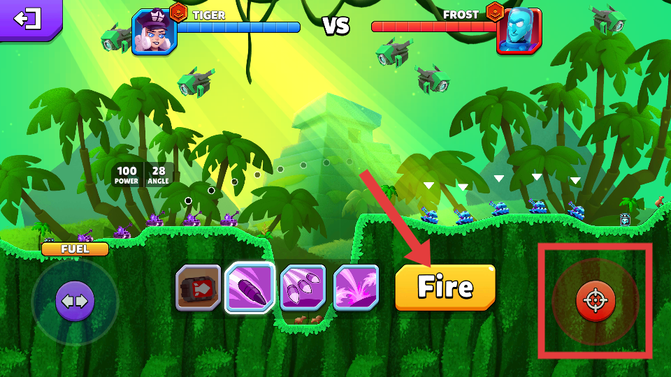 2、戰(zhàn)斗中調整射擊角度和力度,點擊【Fire】發(fā)射炮彈,瞄準敵方坦克進行打擊。