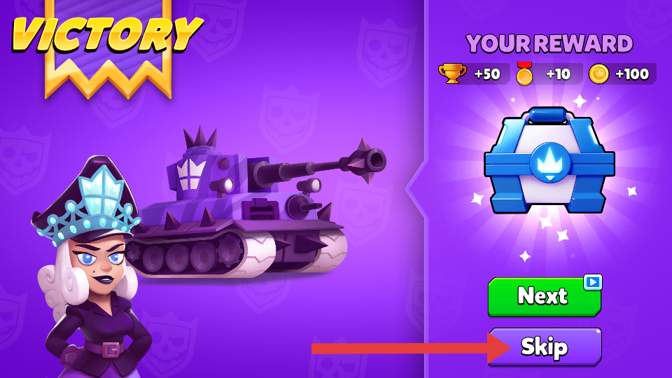 4、勝利后點擊【Skip】跳過獎勵動畫,領取金幣、獎杯等獎勵,用于升級坦克或解鎖新坦克。