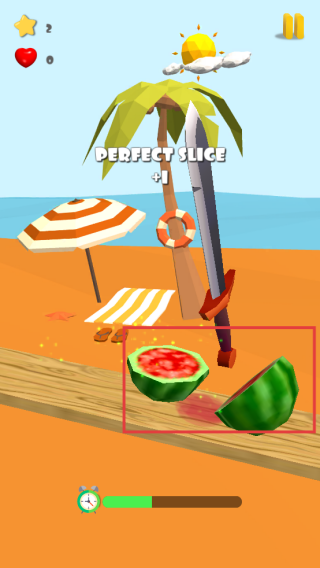 3、切割西瓜時(shí),爭(zhēng)取實(shí)現(xiàn)完美切割以獲得【PERFECT-SLICE】加分,提升游戲表現(xiàn)。