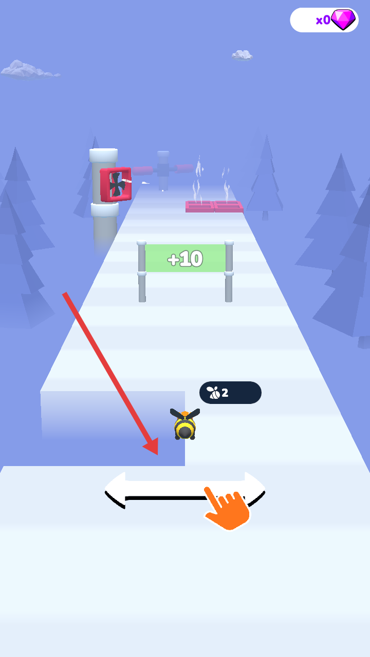 1、滑動(dòng)屏幕操控蜜蜂在雪地賽道開(kāi)始前進(jìn),開(kāi)啟游戲挑戰(zhàn),為后續(xù)收集道具和避開(kāi)障礙做好準(zhǔn)備。
