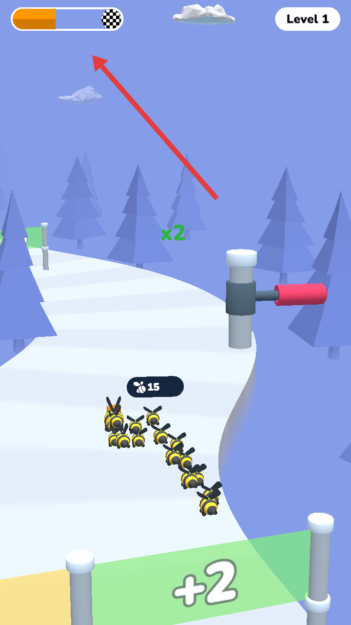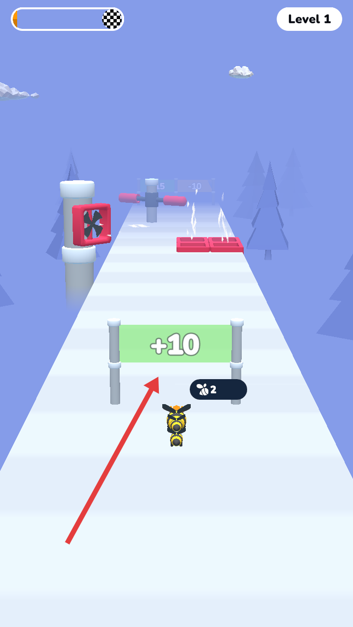 2、收集 + 10 等增益道具,增加蜜蜂數(shù)量,壯大蜂群實(shí)力,助力在雪地賽道上順利推進(jìn)。