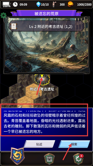 2、在【被遺忘的荒原-Lv.2-附近的考古遺址-(1,2)】區(qū)域,點擊【探索】按鈕,深入該區(qū)域挖掘線索推進任務(wù)。