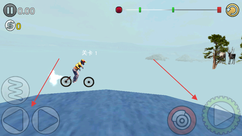 2、進入關卡后,利用左下角方向鍵和右下角控制鍵,操控自行車在地形中行駛。