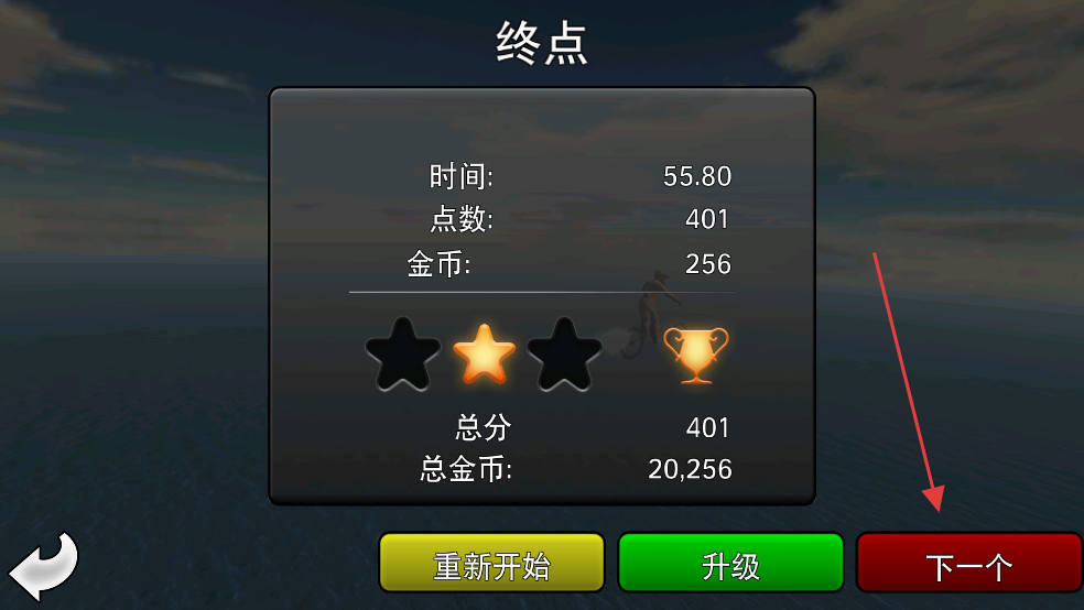 4、到達終點后,可根據獲得的分數和金幣,選擇【重新開始】【升級】或【下一個】關卡繼續(xù)挑戰(zhàn)。