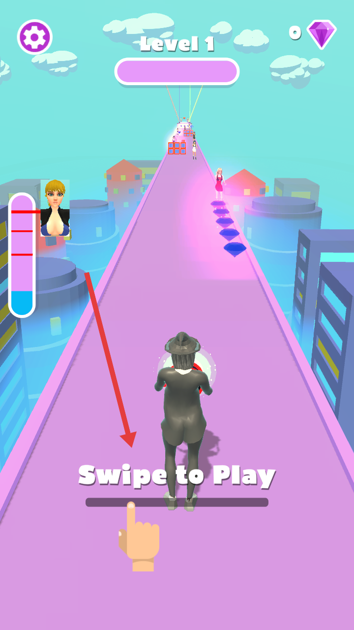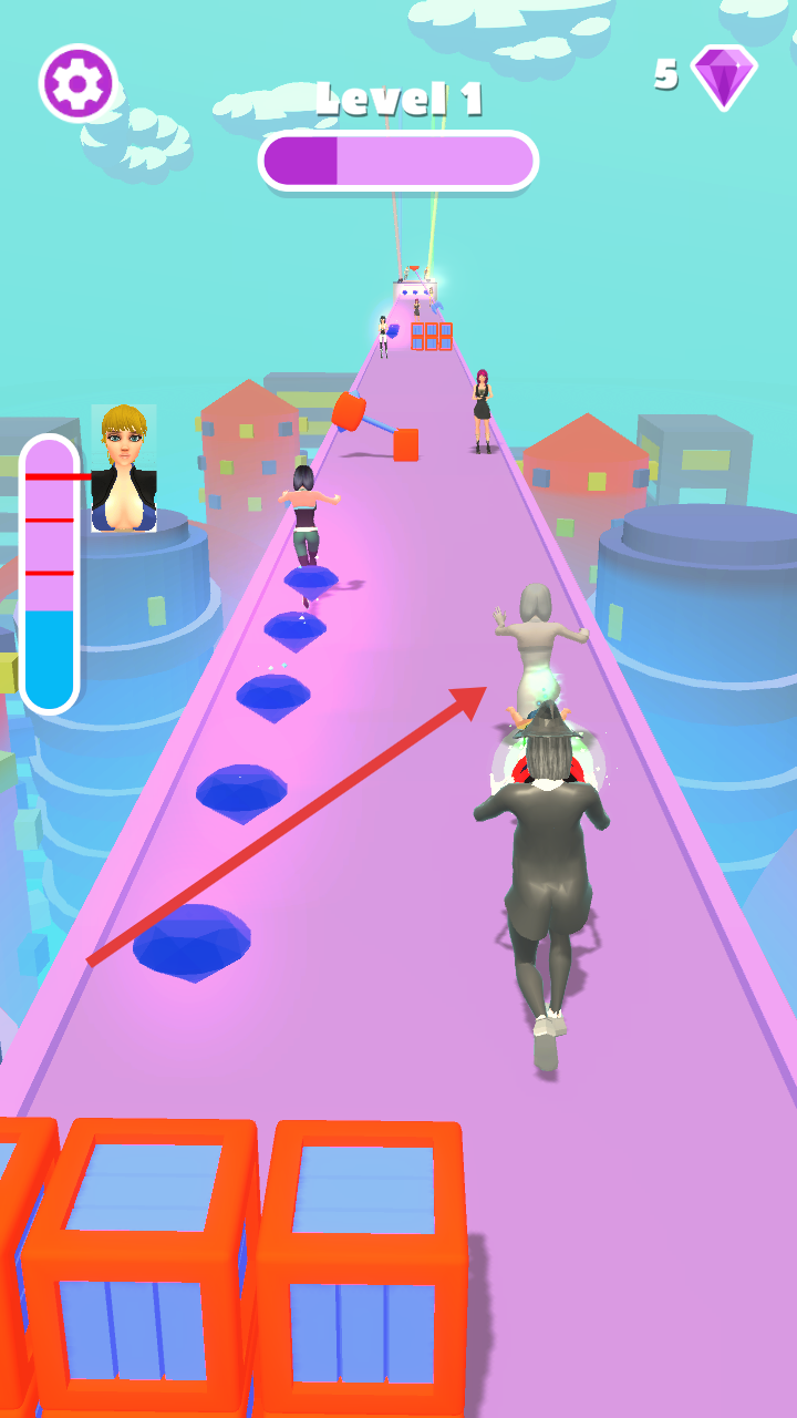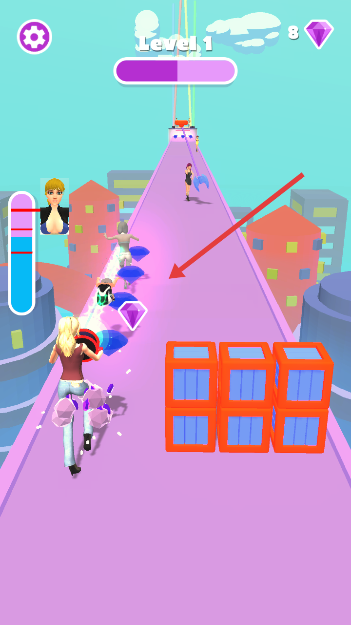 2、在賽道上收集鉆石,吸取其他角色,積累變身進度,向關卡終點推進。