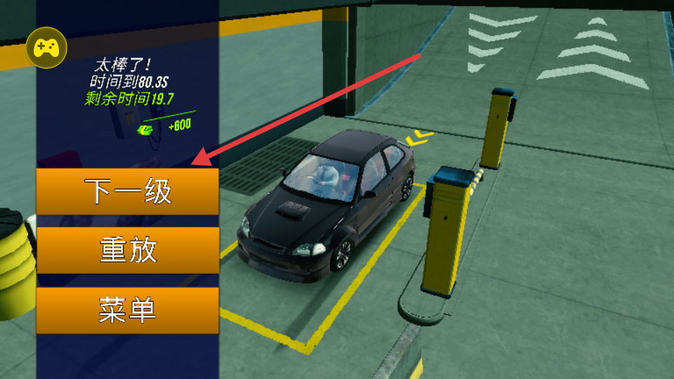 4、關(guān)卡完成后,點(diǎn)擊【下一級(jí)】挑戰(zhàn)更高難度的停車(chē)關(guān)卡,積累金幣獎(jiǎng)勵(lì),提升游戲進(jìn)度和停車(chē)技巧。