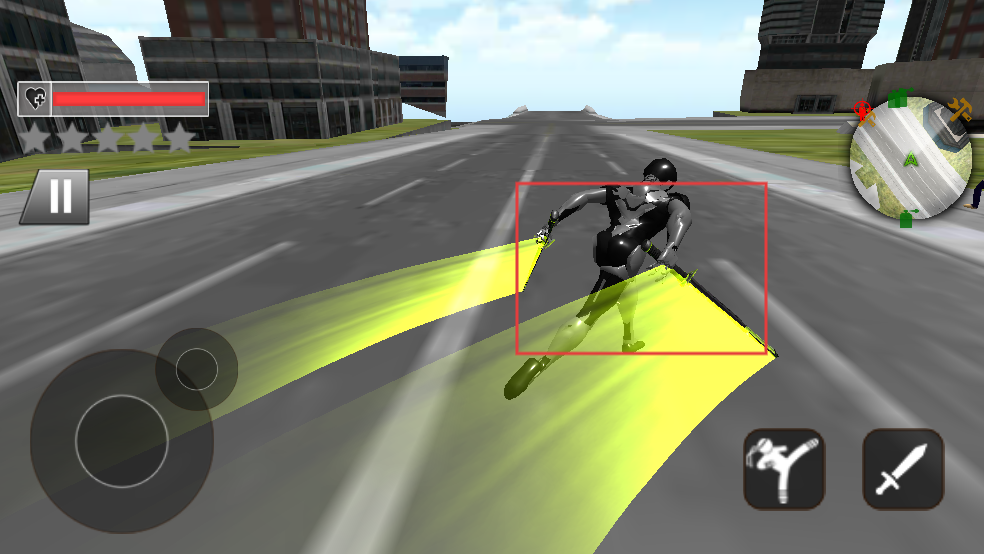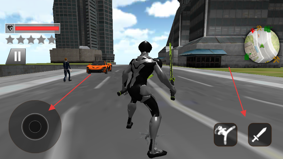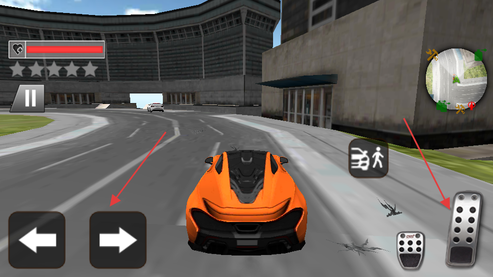 4、解決完敵人后拿取路邊的跑車,通過(guò)左側(cè)方向按鈕和右側(cè)踏板按鈕操控車輛,在都市道路中快速移動(dòng)探索。