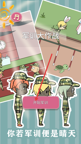 1、點擊【開始軍訓】進入游戲,留意游戲標題【軍訓大作戰(zhàn)】,了解游戲主題,為后續(xù)軍訓挑戰(zhàn)做好準備。