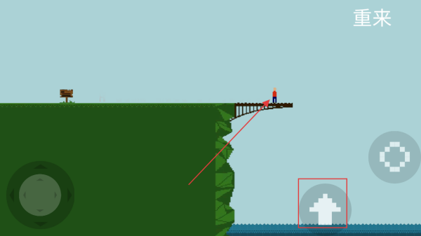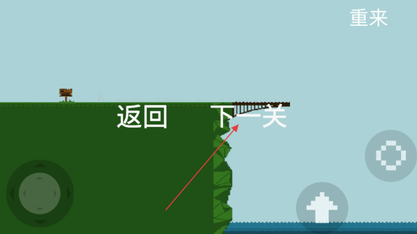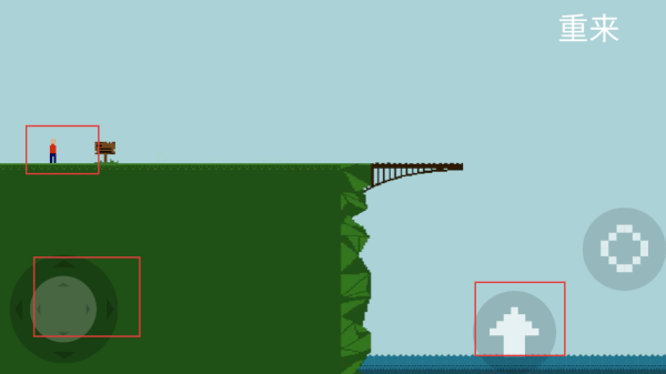 2、游戲中利用左側(cè)虛擬搖桿控制角色移動(dòng),右側(cè)向上箭頭按鍵控制角色跳躍,先操控角色到橋邊。