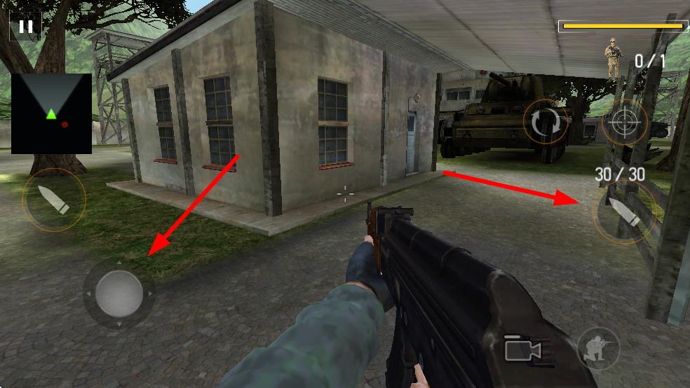 2、利用左側(cè)搖桿移動(dòng),右側(cè)可切換武器,根據(jù)戰(zhàn)場情況選擇合適武器,靈活移動(dòng)尋找敵人。