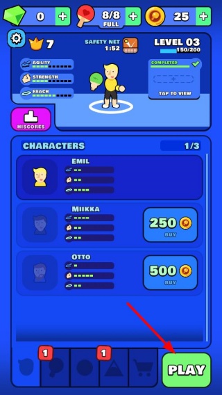 1、開局可查看角色屬性,積累金幣后可提升角色提升能力,隨后點(diǎn)擊【PLAY】開始游戲。