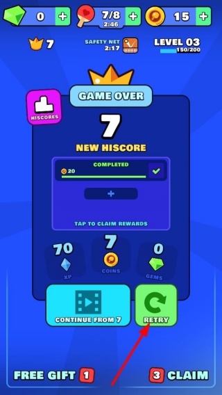 4、游戲結(jié)束后會(huì)顯示本局的分?jǐn)?shù),點(diǎn)擊【RETRY】重新挑戰(zhàn),通關(guān)可領(lǐng)取獎(jiǎng)勵(lì),積累分?jǐn)?shù)刷新新高分。