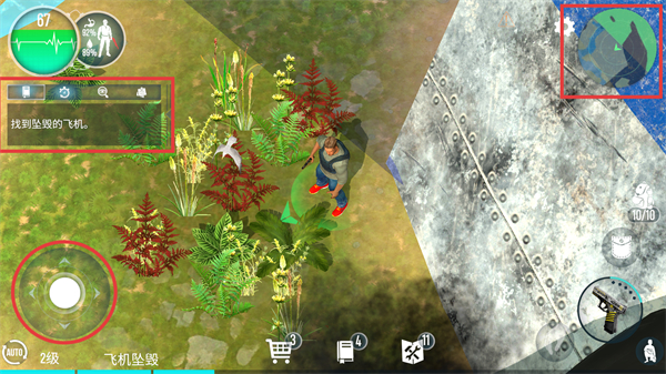 1、在“飛機(jī)墜毀”區(qū)域,根據(jù)任務(wù)提示“找到墜毀的飛機(jī)”,利用右側(cè)地圖導(dǎo)航,控制角色移動(dòng),探索該區(qū)域。