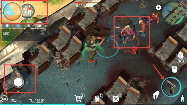 2、遭遇僵尸時(shí),使用右側(cè)槍械攻擊,注意走位,避免被僵尸圍攻,確保自身安全。