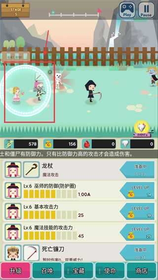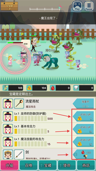2、利用獲得的金幣,點(diǎn)擊升級(jí)巫師防御、基本攻擊力等屬性,提升戰(zhàn)力。